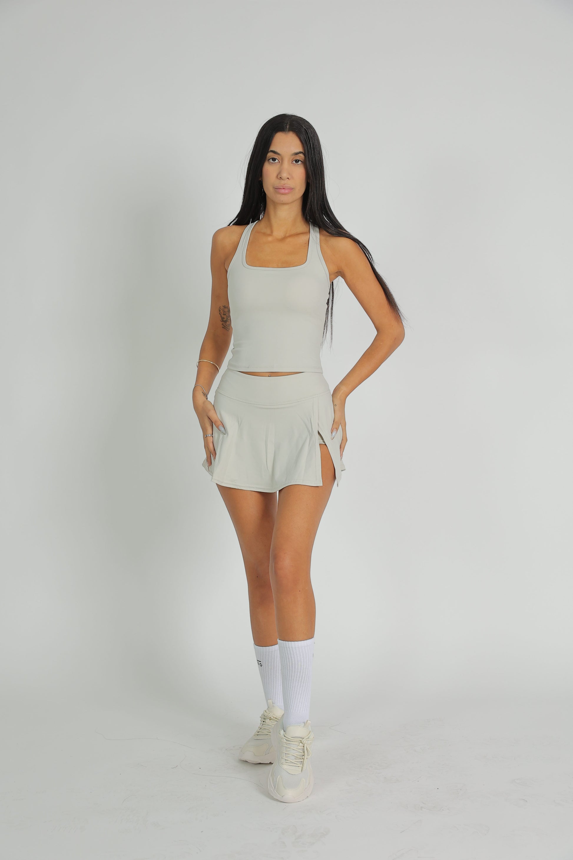 A sleek, fitted tank top featuring a classic scoop neckline and a smooth, stretchy fabric that hugs your shape comfortably. Perfect for layering or wearing on its own for a clean, modern look. With a racerback design offers a sporty, flattering shape while allowing full range of motion. Pair it with the luna skirt.